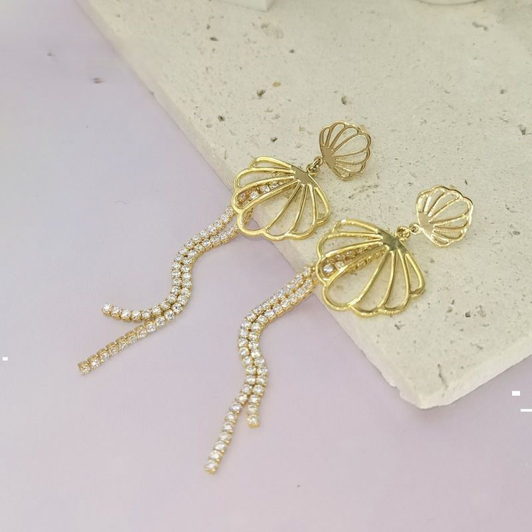 جزئیات: گوشواره طرح صدف دوکفه آویز نگیندار